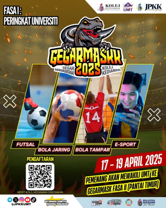 Program GEGARMASKK FASA I ini telah diadakan pada 17 April hingga 19 April 2025 dan melibatkan seramai 12 orang Jawatankuasa Perwakilan Kolej Kediaman, 30 orang assist JPKK, dan 280 peserta terlibat dalam program tersebut. Program ini telah bermula pada 17 April (Khamis) dengan sukan Futsal yang diadakan di Gelanggang serbaguna B), 18 April (Jumaat) dengan sukan Futsal dan E-sukan di Gelanggang serbaguna B dan Dewan Al-Irfan, dan hari terakhir 19 April (Sabtu) dengan sukan Bola jaring dan Bola tampar di Gelanggang serbaguna PISM. Majlis Perasmian Penutup telah diadakan di Stadium Kompleks Sukan. Majlis Perasmian Penutupan Program GEGARMASKK bertujuan untuk membuka ruang bagi melahirkan mahasiswa UMT yang bergiat aktif serta menyumbang kecemerlangan kepada kolej kediaman khususnya dalam bidang sukan dan permainan. Program ini juga memberi focus utama kepada penghuni kolej kediaman bagi mencari pemenang dalam kalangan atlet yang akan mewakili Kolej Kediaman UMT ke GEGARMASKK fasa II. Majlis Perasmian Penutup telah dirasmikan oleh En Zulkarni bin Ismail selaku Timbalan Pengarah dalam Kampus, Kolej Kediaman. Seramai satu wakil dari Majlis Perwakilan Pelajar (MPP), 12 orang ahli JPKK, 28 orang assist JPKK, 6 orang felo dan 148 turut terlibat dalam Majlis Perasmian Penutupan.