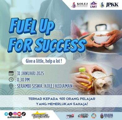 Program ini adalah merupakan satu program yang dianjurkan oleh Jawatankuasa Perwakilan Kolej Kediaman (JPKK) untuk menjaga kebajikan mahasiswa/i di kolej kediaman dalam bentuk pemberian makanan. Sebelum program ini dijalankan, pihak Jawatankuasa Perwakilan Kolej Kediaman(JPKK) telah membuka satu borang tinjaun untuk diisi oleh pelajar yang memerlukan bantuan makanan. Seramai 400 pelajar telah mengisi borang soal selidik yang diedarkan. Bagi program fuel up for success fasa 1, pihak Jawatankuasa Perwakilan Kolej Kediaman (JPKK) telah menyediakan burger daging dan burger ayam untuk mahasiswa/i. Burger yang diedarkan juga telah ditempah dari peniaga di kalangan pelajar sendiri. Makanan yang disediakan telah diedarkan oleh pihak Jawatankuasa Perwakilan Kolej Kediaman (JPKK) pada 31 Januari 2025 di Serambi Siswa, Kolej Kediaman. Mahasiswa/i perlu berdaftar dahulu sebelum mengambil makanan yang disediakan. Baki makanan yang tidak diambil telah diberikan kepada mahasiswa/i yang berada di Kafe Syeikh Abdul Malek dan Kafe Abdul Rahman Limbong.