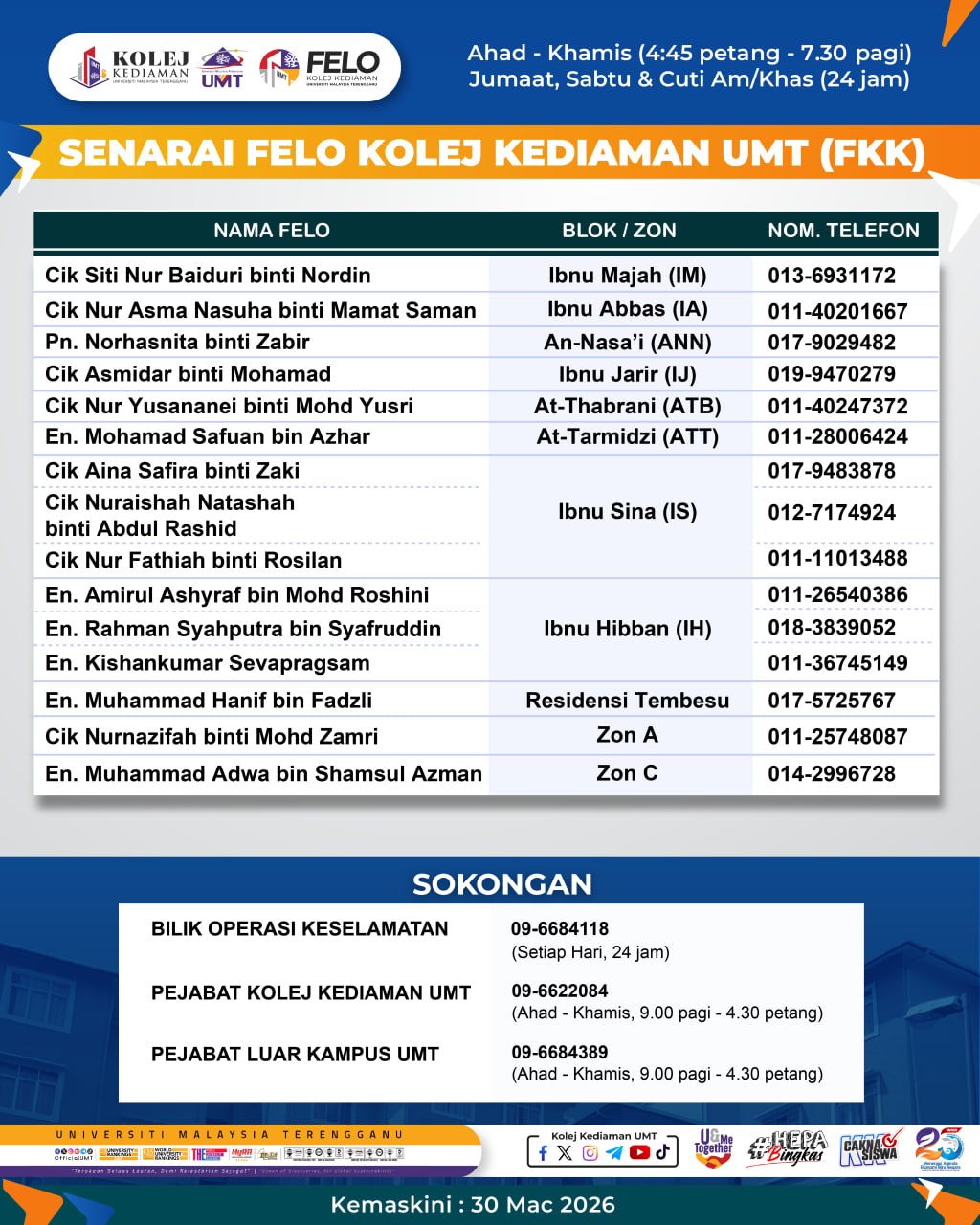MAKLUMAN SENARAI FELO KOLEJ KEDIAMAN UMT TERKINI