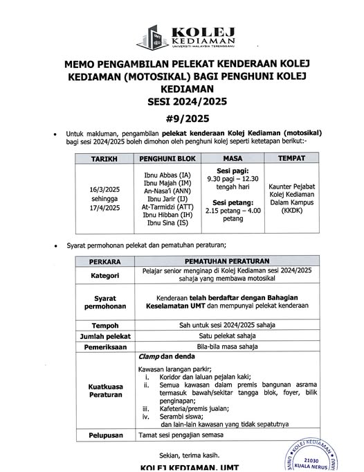 MEMO PENGAMBILAN PELEKAT KENDERAAN KOLEJ KEDIAMAN (MOTOSIKAL) BAGI PENGHUNI KOLEJ KEDIAMAN SESI 2024/2025